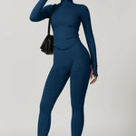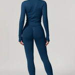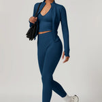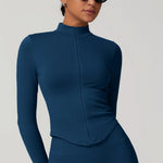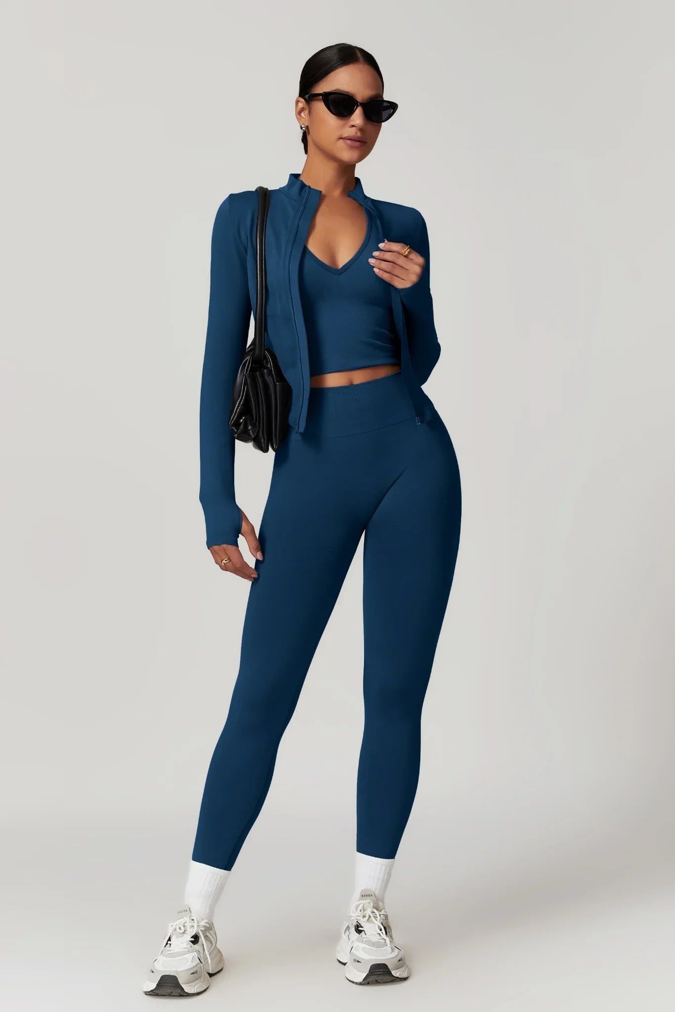 Bluza CORE z wysokim kołnierzem, zamkiem i subtelnym krojem V na dole, który modeluje sylwetkę. Prążkowane detale, długi rękaw z otworami na kciuki i materiał, który pracuje z Tobą. Od jogi po pilates, od domu po miasto — CORE to warstwa, która robi różnicę.