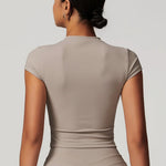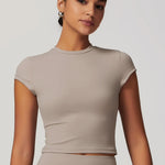 Crop Top NERVE z okrągłym dekoltem, delikatnymi krótkimi rękawkami i przycięciem na talii. Miękki, elastyczny materiał, który porusza się z Tobą — od porannej jogi po wieczorny relaks. Prosty krój, który dobrze wygląda. Bez wysiłku, bez nadmiaru. Po prostu NERVE.